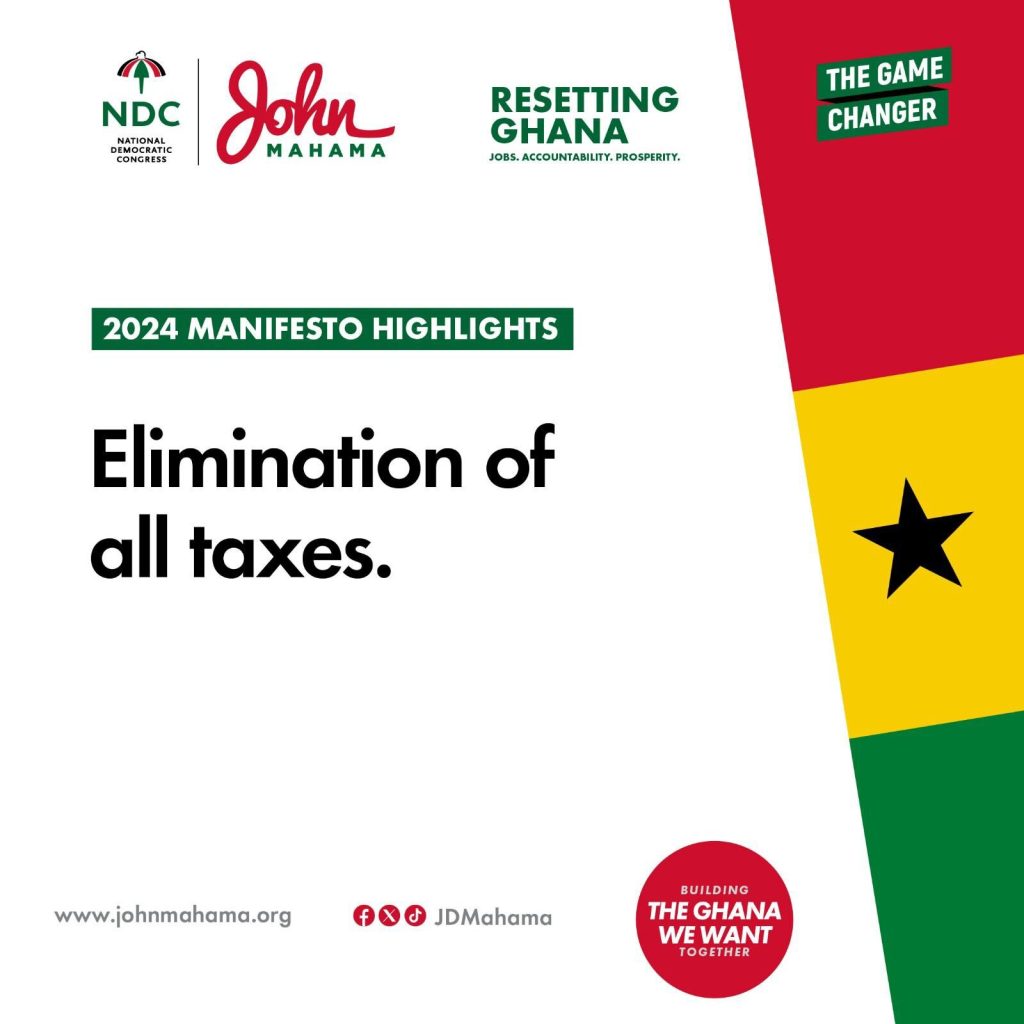 Claim: An X user has alleged that John Dramani Mahama, the 2024 Presidential candidate of the opposition National Democratic Congress (NDC) has promised to scrap all taxes in Ghana if elected in Dec. 2024.