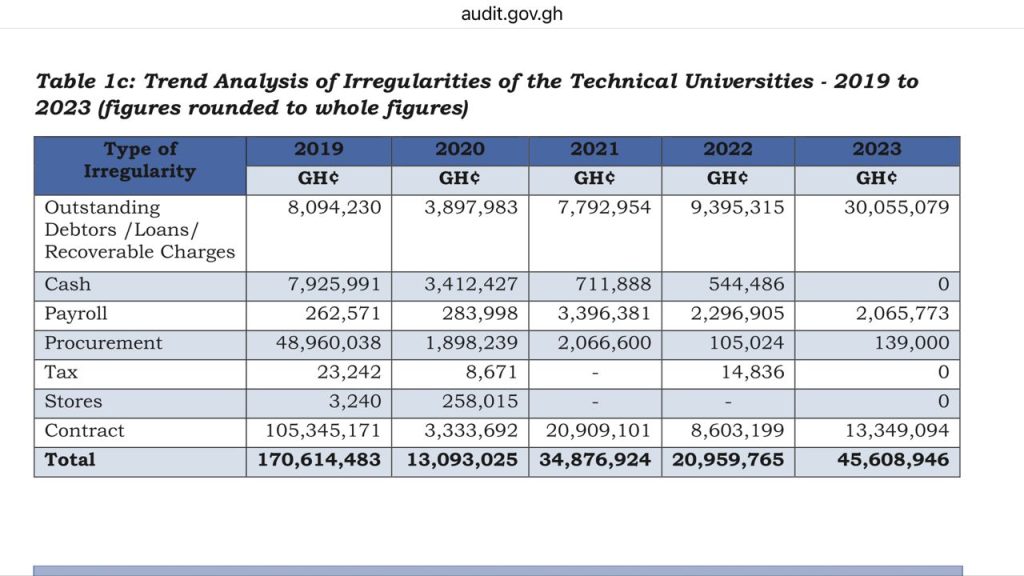 Also, the total values of various irregularities of the technical universities for the year ended Dec. 31, 2023, were GHȼ45,608,946 and GHȼ20,959,576 for 2022. The financial irregularities for the Colleges of Education in 2023 was GHȼ7,975,574, the Auditor-General’s report has said.