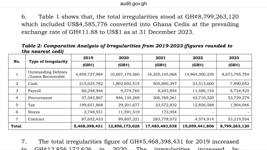 The Auditor-General’s report showed that as of Dec. 31, 2023, financial irregularities at Public boards, corporations, and other statutory institutions were GHȼ8,799,263,120, and that of 2022 were GHȼ15,059,441,806.