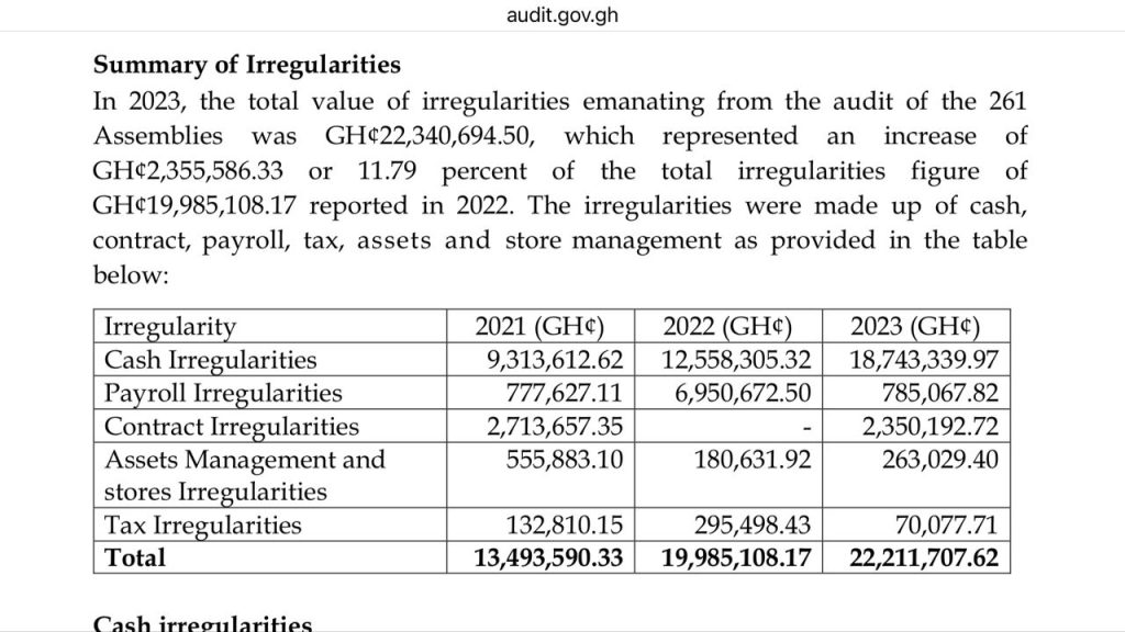 Financial irregularities at the district assemblies for the year ended Dec. 31, 2023, were GHȼ22,211,707.62 and GHȼ19,985,108.17 in 2022, the Auditor-General had revealed.