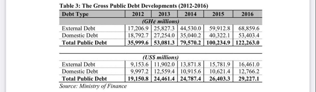 Similarly, the Annual Debt Management Report for the Year 2016, submitted by the country’s former Finance Minister Ken Ofori-Atta, disclosed Ghana’s total public debt was $29.2 billion, equivalent to GHȼ122.2 billion.